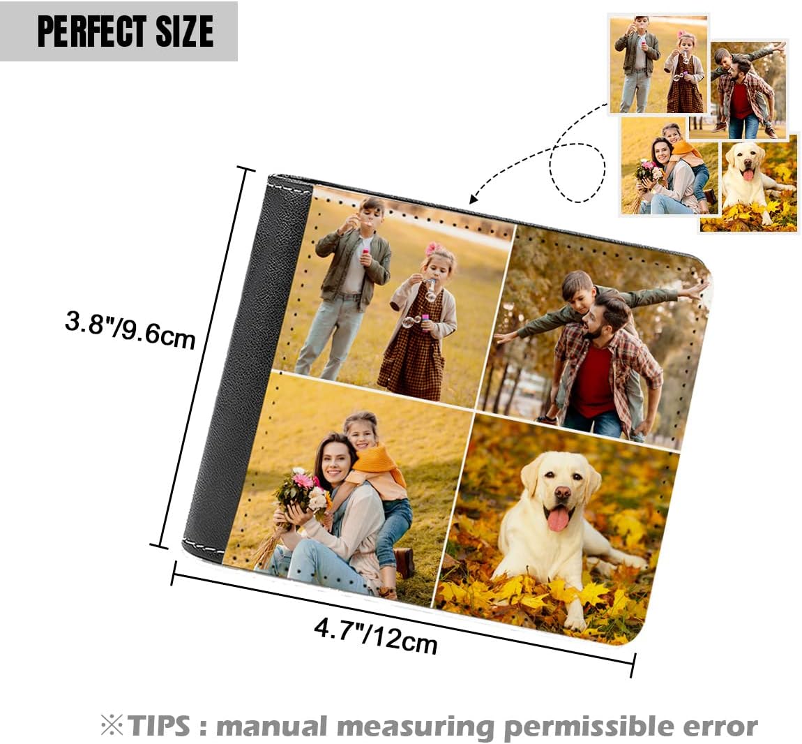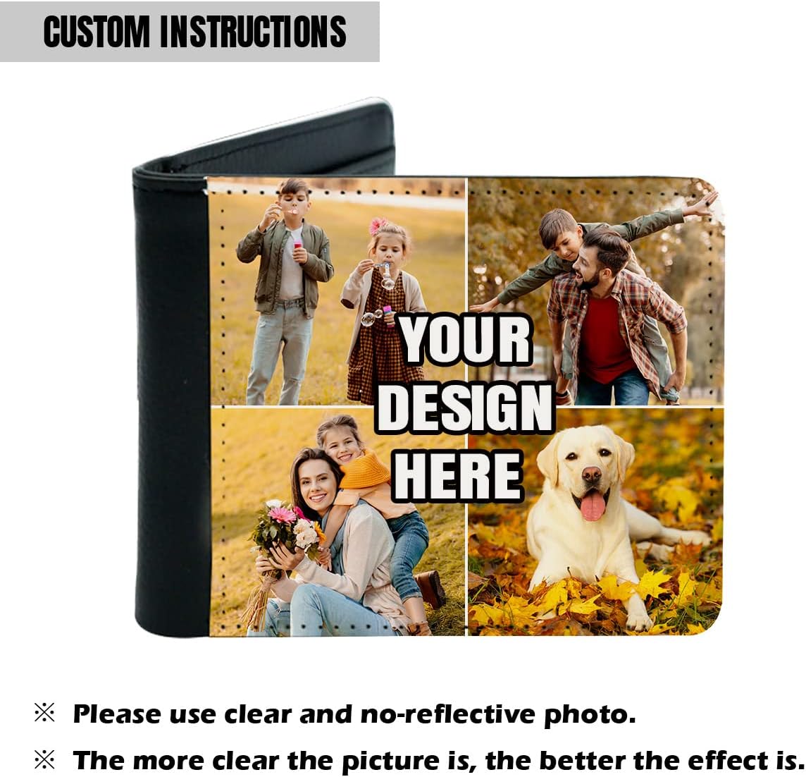 Personalized Photo Wallet The Most Heartwarming Gift for The Most Loved Ones!You can upload any memorable photo, you can upload photos of your loved ones, your family, your friends or your pets. You can also express your love with a custom name, a message or just an I love you!❤Easy to customize!Step 1: Click "Personalize" to upload photos or add textStep 2: Adjust the layout formatStep 3: Add to cart ❤Fashion comes from classic!Material: PU LeatherDimensions: 4.7x 3.8x 0.6 inches❤Minimalist wallet with plenty of room!1 ID Window7 card slots1 cash pockets2 Inner card slots❤Maintenance Tips! How to clean your wallet: If you find dirt or stains, wipe it clean with a damp cloth.Please don't put your wallet in the sun, and don't soak your wallet in water.If the wallet gets wet, pat it with a dry cloth first, then let it dry at room temperature. Use the breeze from a fan or other device to help dry the purse.If for any reason you are not satisfied with our wallet, please feel free to contact us and we will do our best to resolve your issue quickly and efficiently