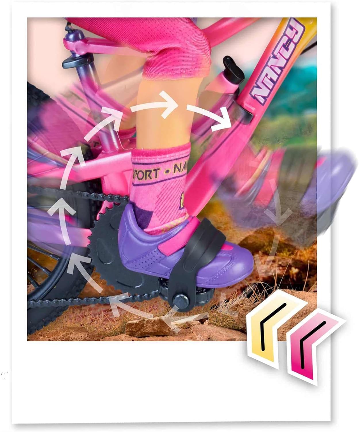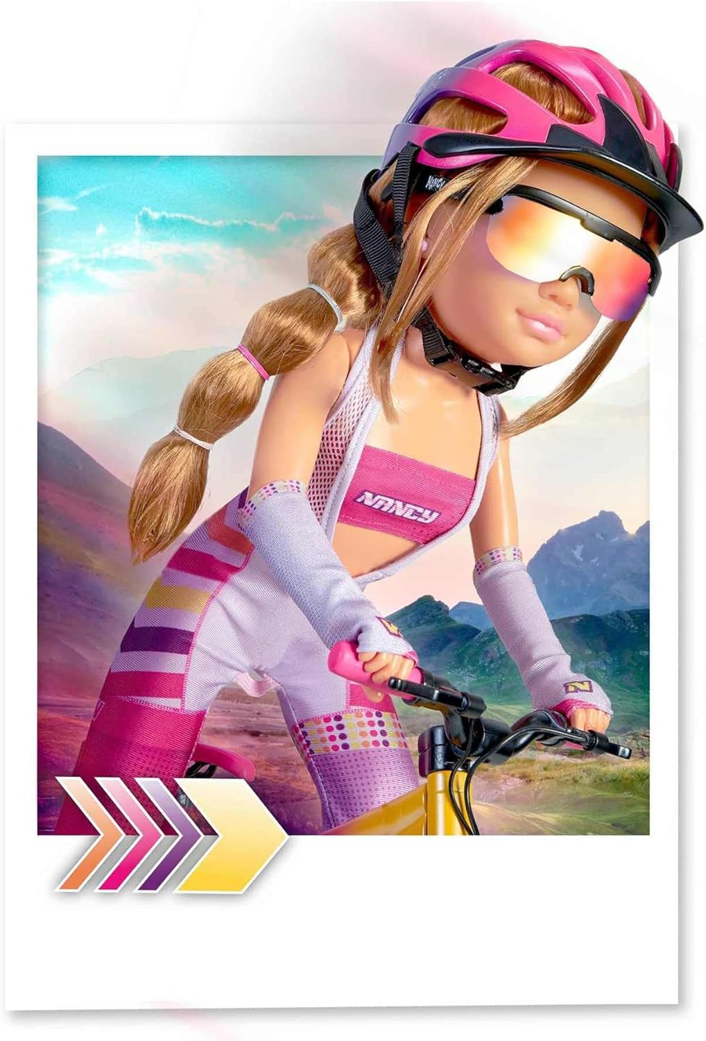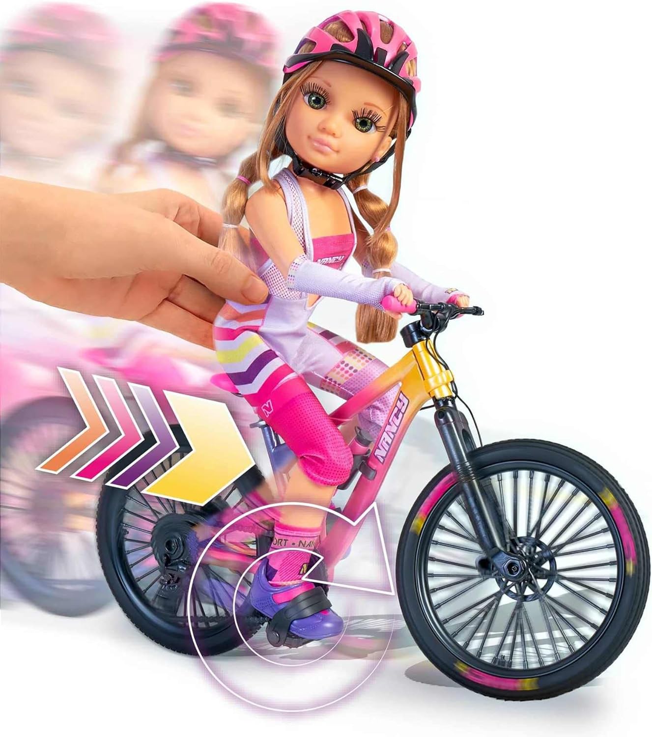 NANCY A Mountain Bike Day is the new articulated doll ready for sport. NANCY is ready to start a new outdoor sport! So get ready to be carried away by imagination as NANCY rides her ultra pro mountain bike. Place NANCY in the seat of her bike (the doll is articulated so she can sit) slide her feet onto the pedals, push her and see how well she can ride. She has also chosen the latest trends in mountain bike accessories to prepare her first outing, such as her blue cycling shoes, her eye-catching sunglasses, pink and blue helmet and her pink water bottle to prevent dehydration.